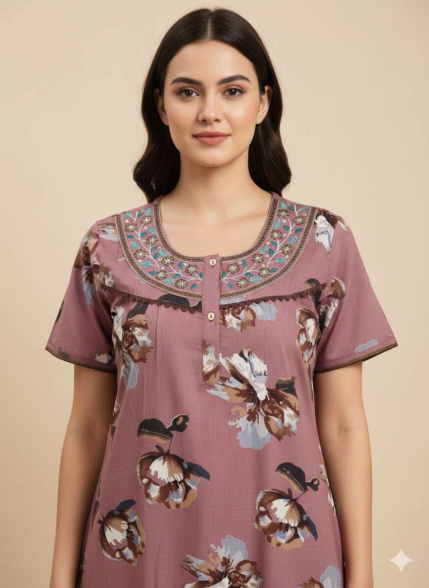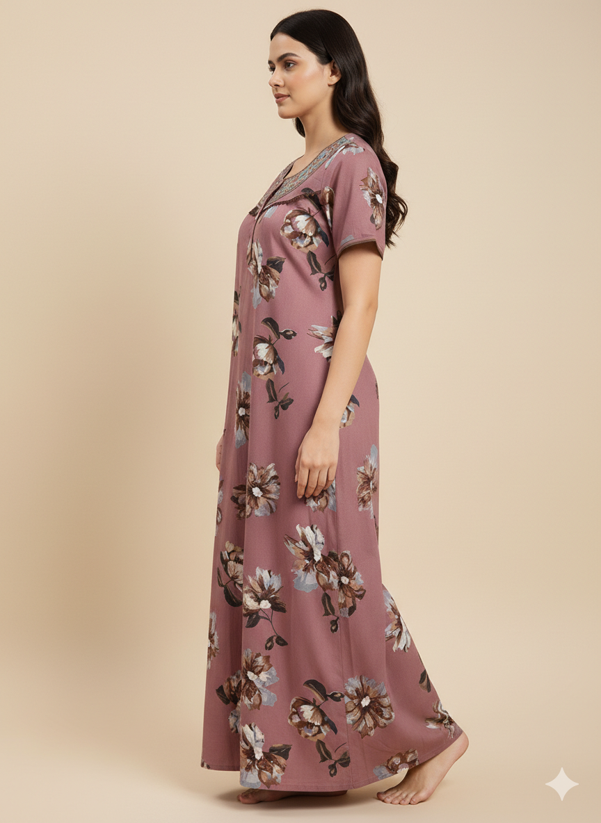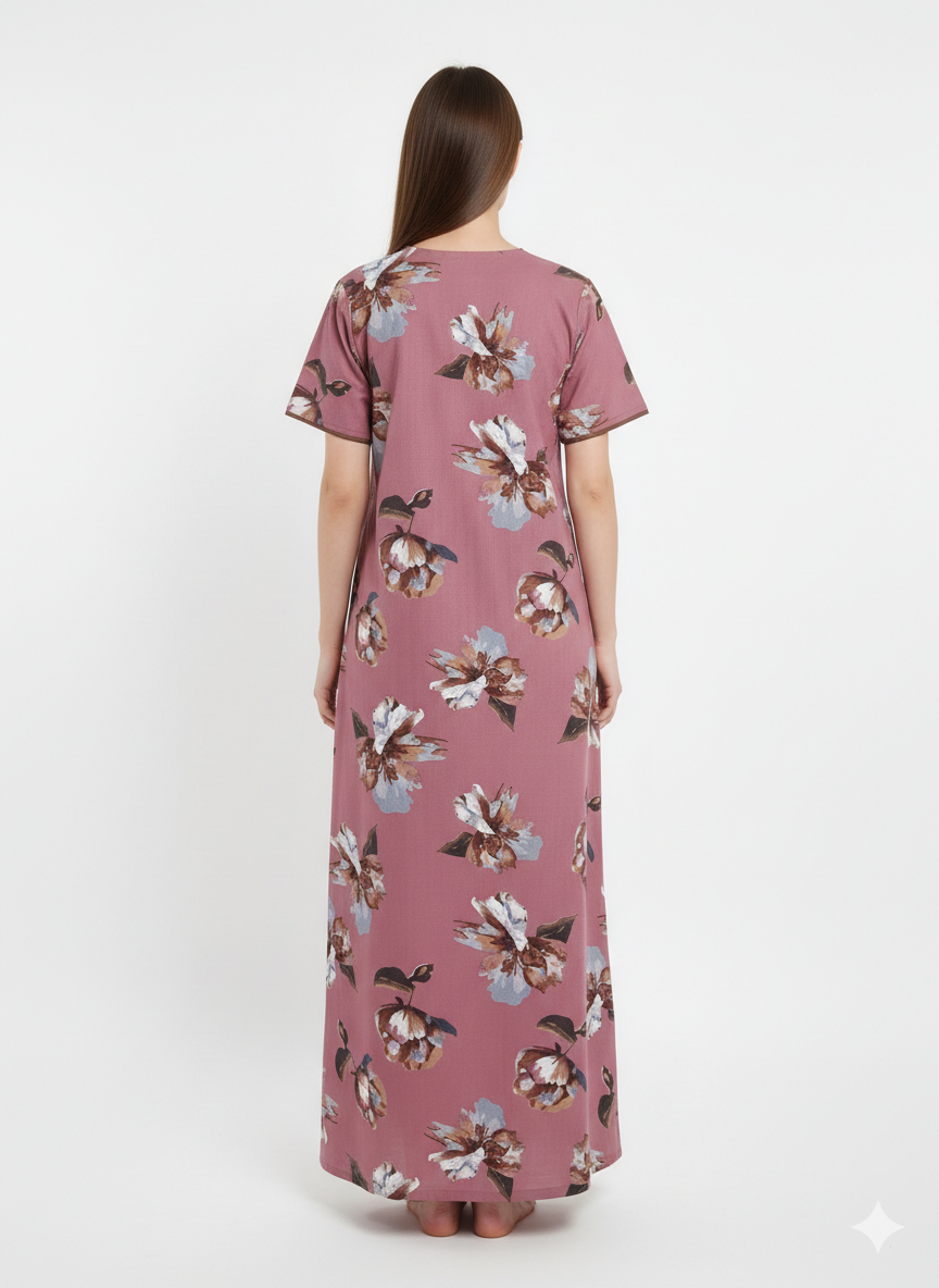 🌸 Alpine Women’s Printed Long Nightgown | Short Sleeves | Full-Length | Side Pocket | Soft Comfortable Nightwear