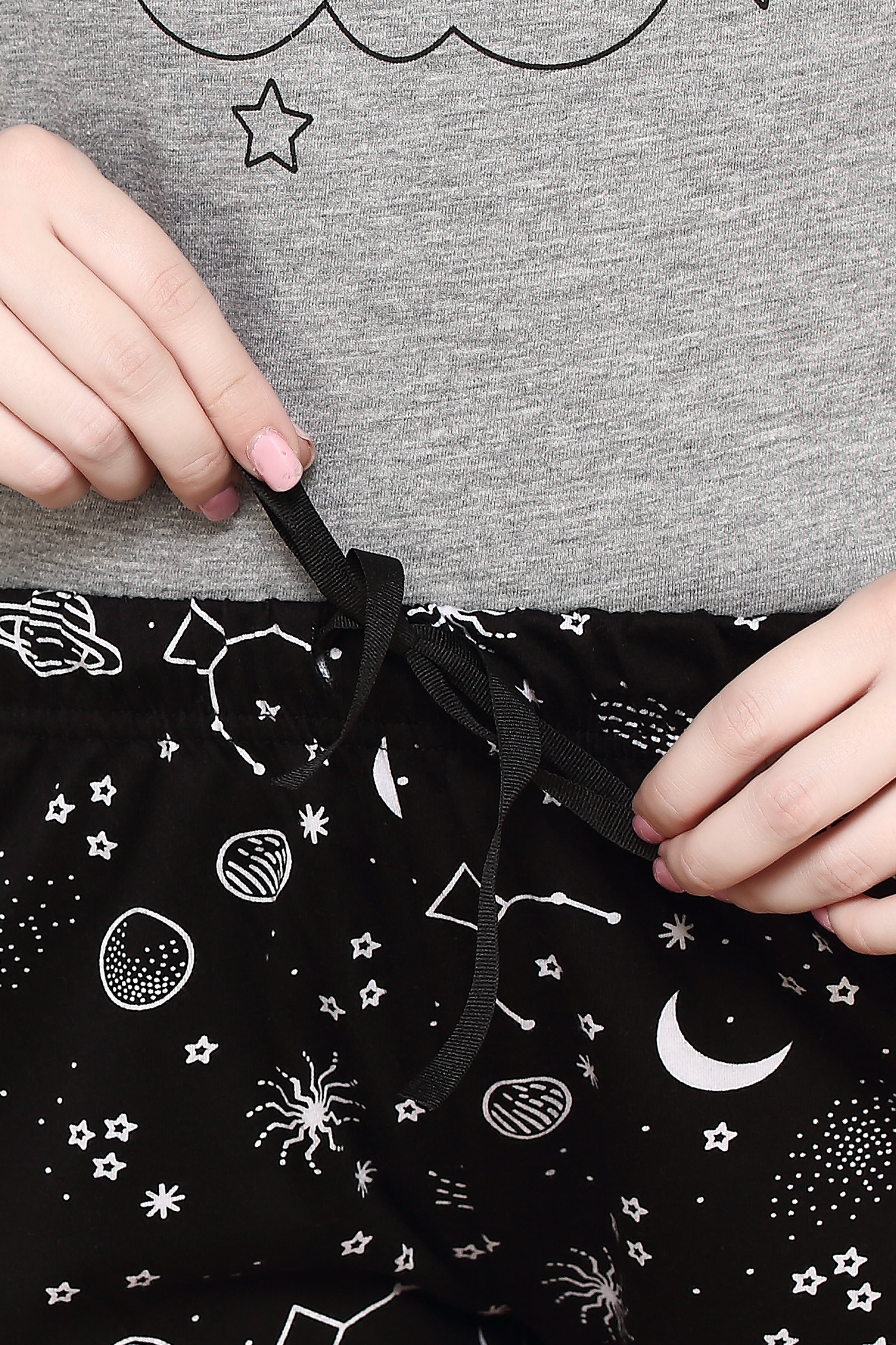 evolove Castor Grey Round Neck Galaxy print Women's (Shorts set), (Grey & Black)