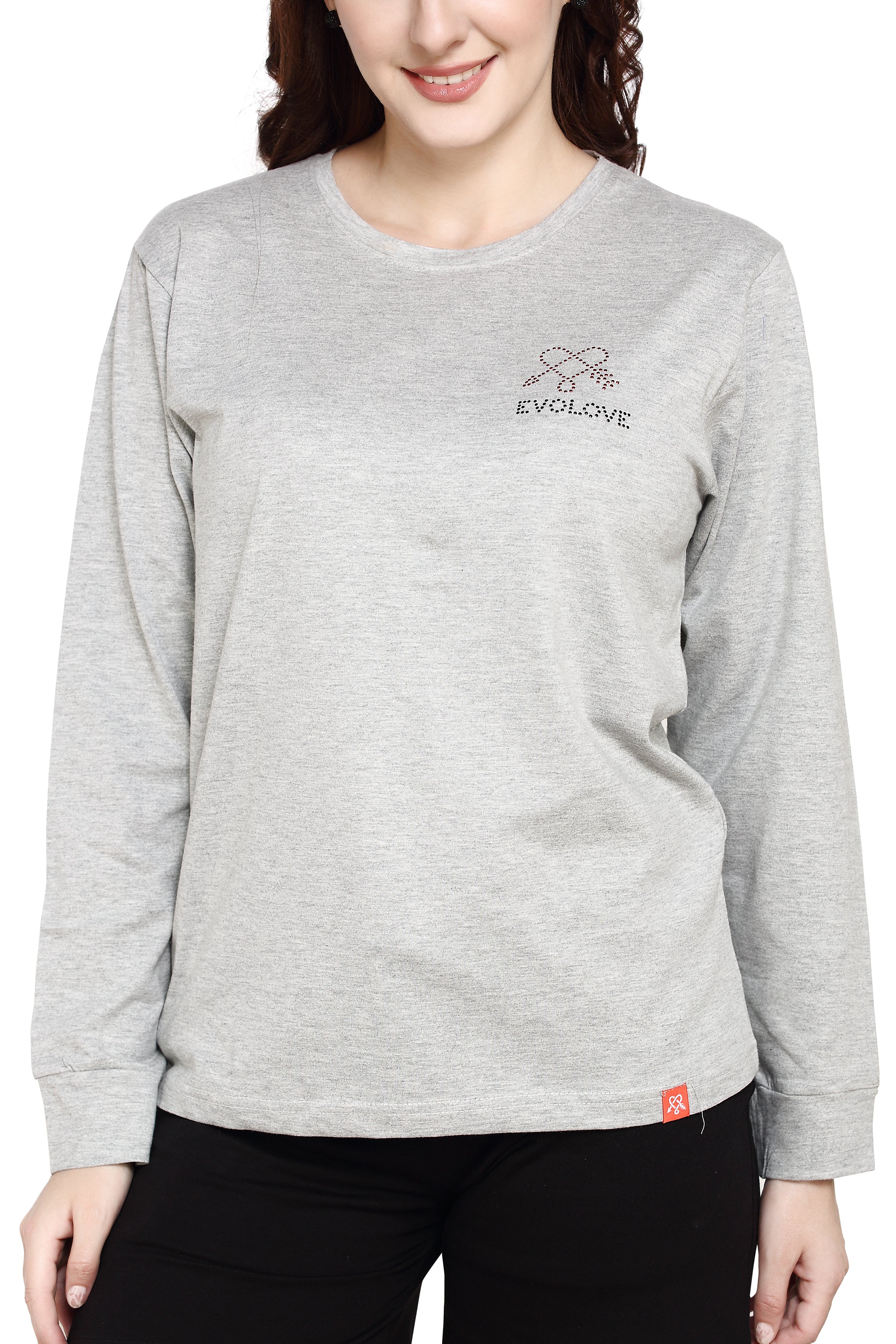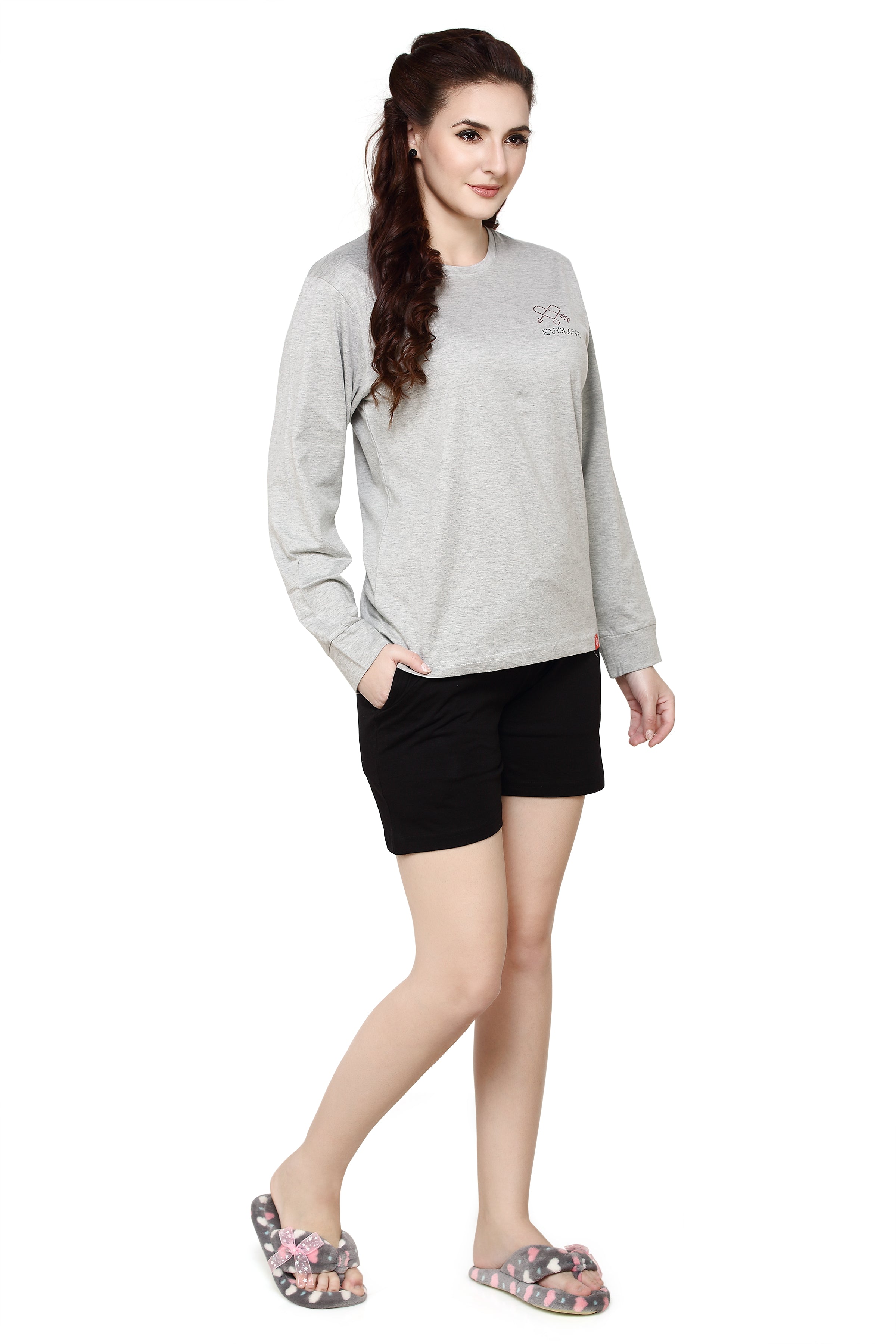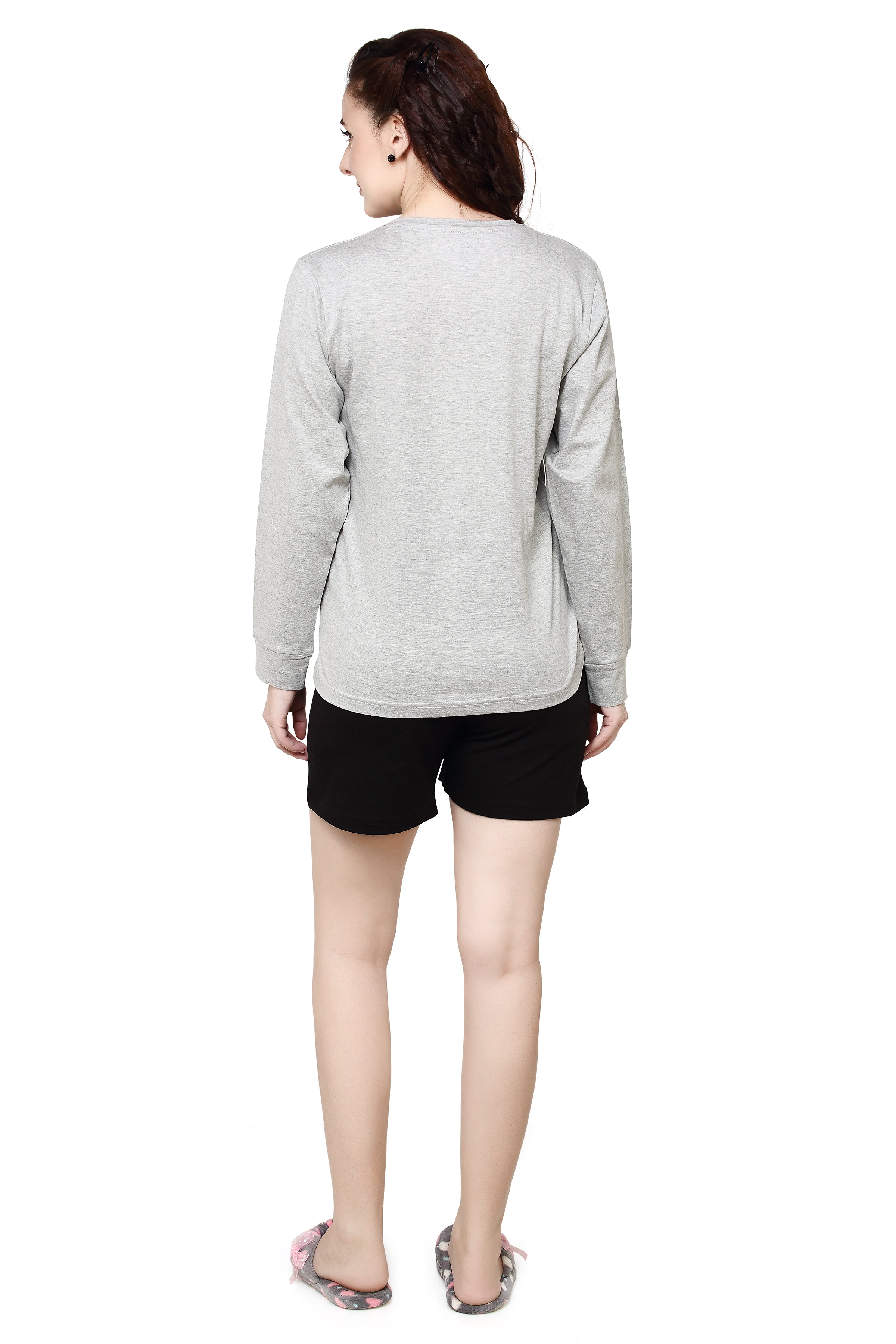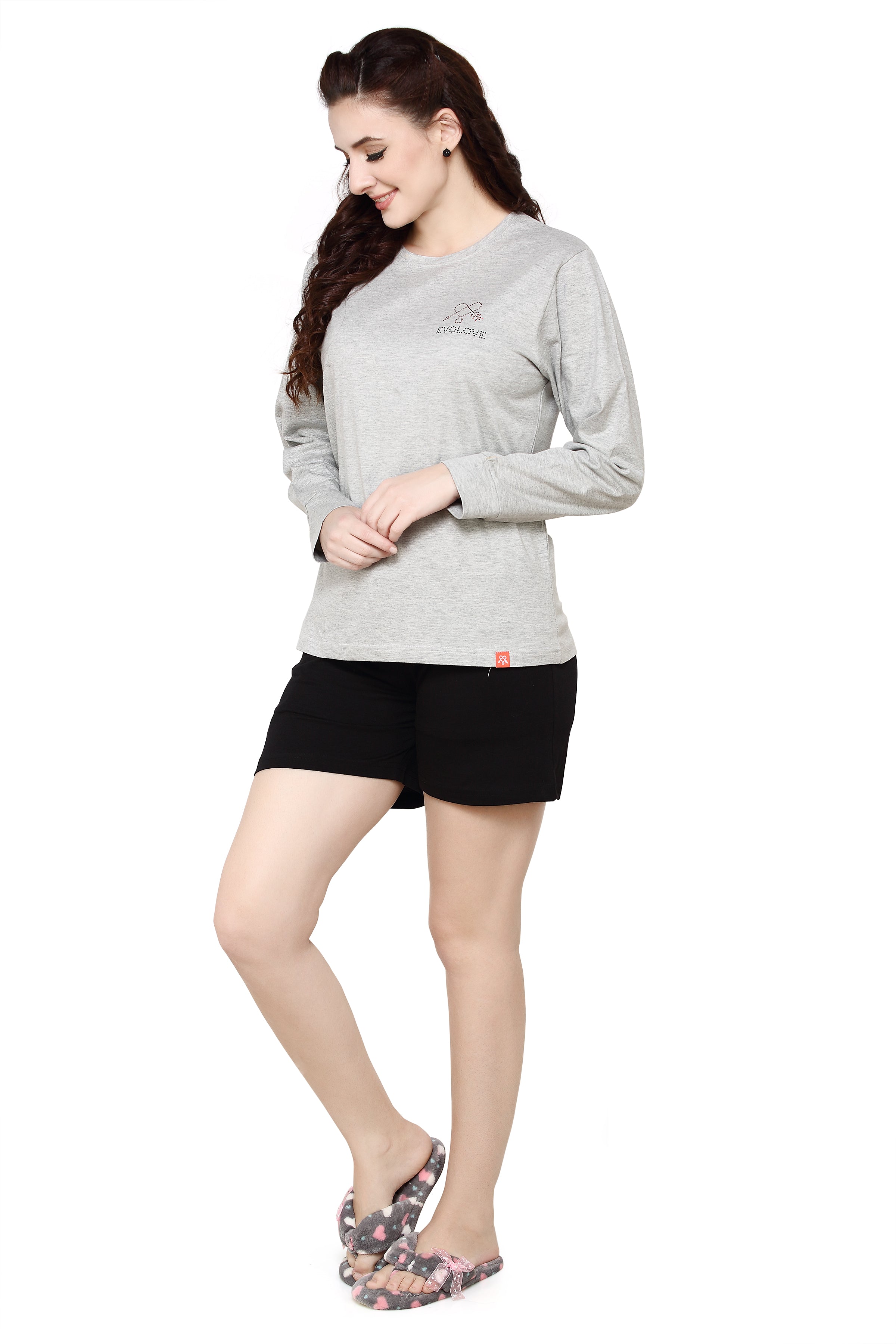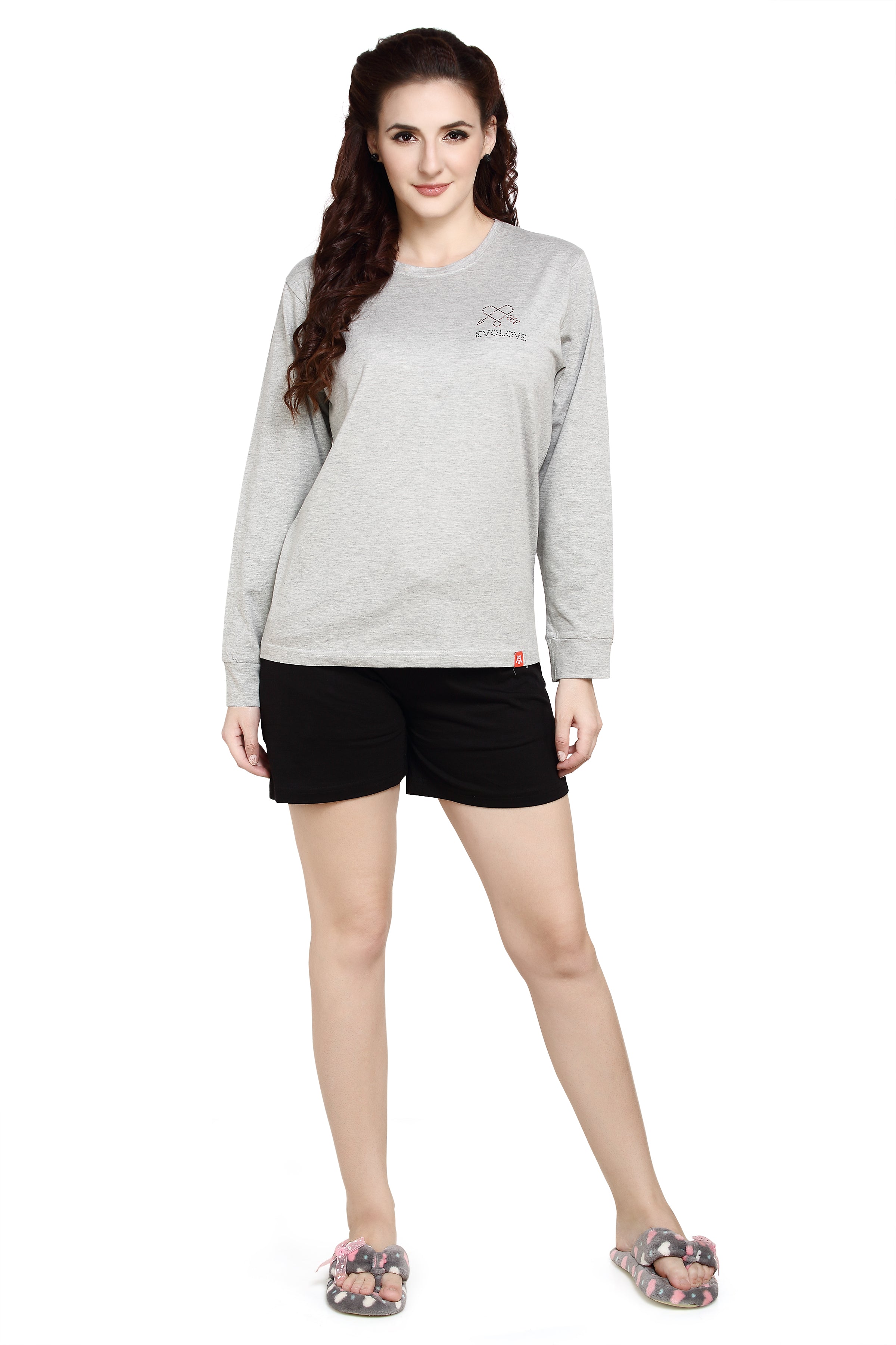 evolove Grey Round neck evolove Print Women's Full sleeve (Shorts set) Night suit