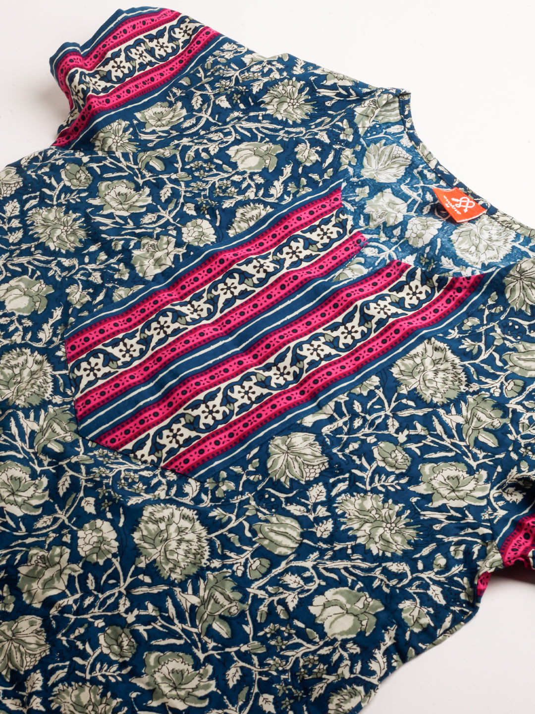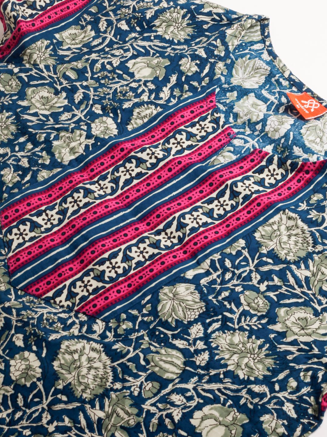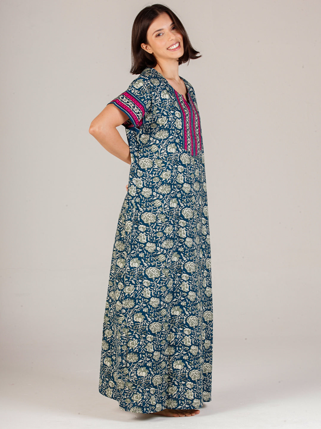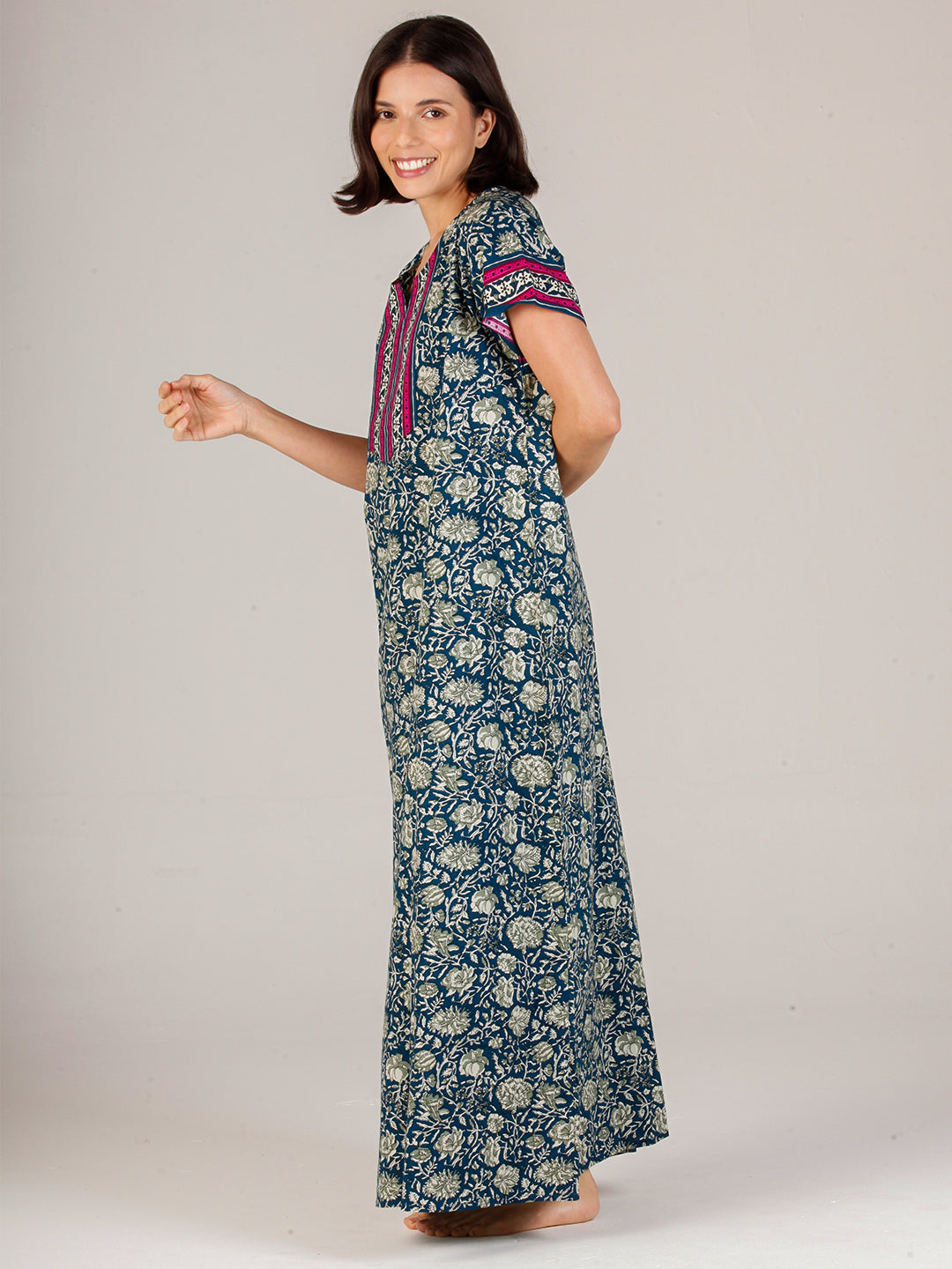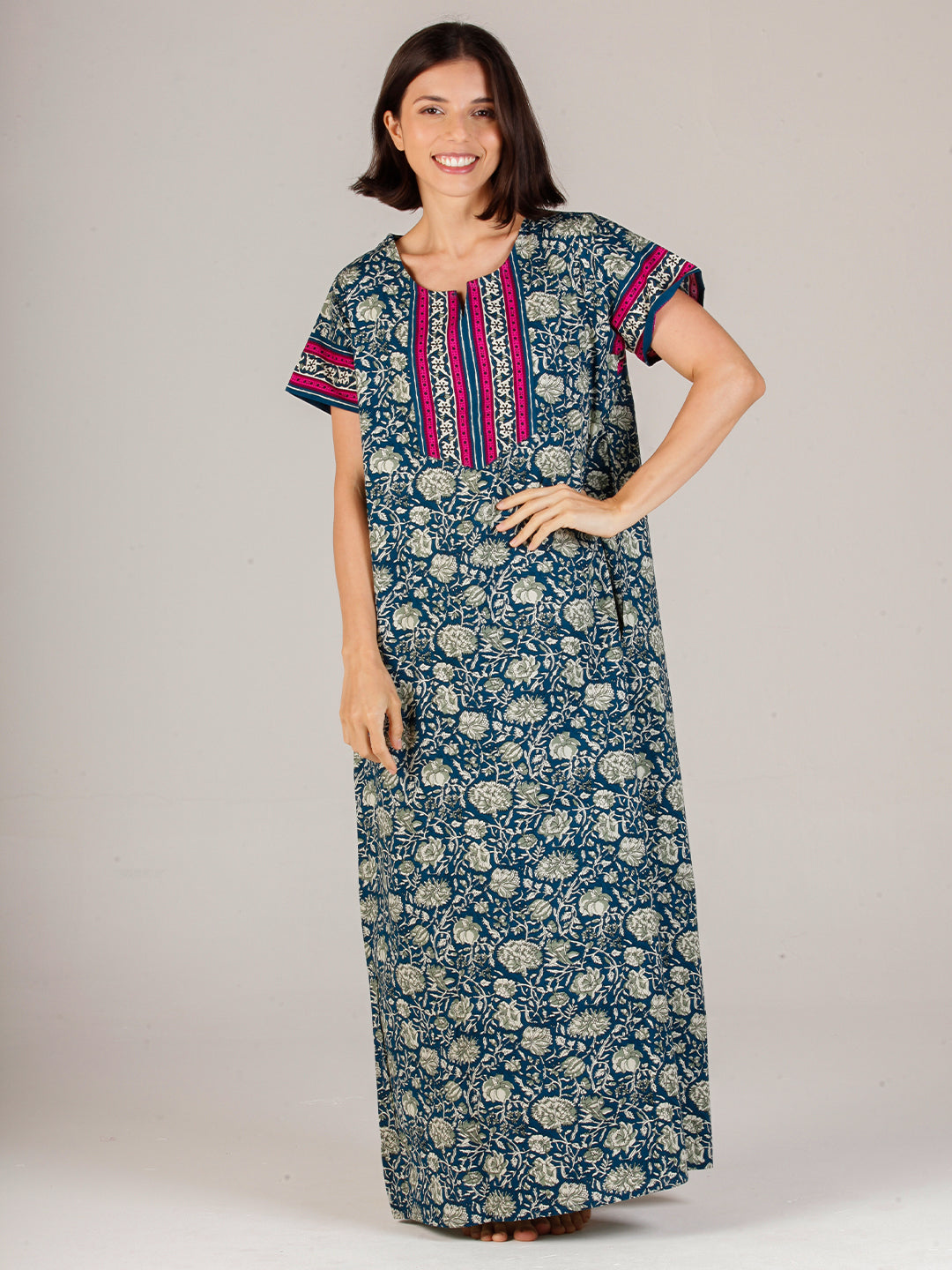 - Design & Style : The Button Closure Maxi or Nighty has Side Pocket to keep your Phone or Other Goodies Safe; Navy & Light Blue in Colour & Floral Printed Stylish Design work done.