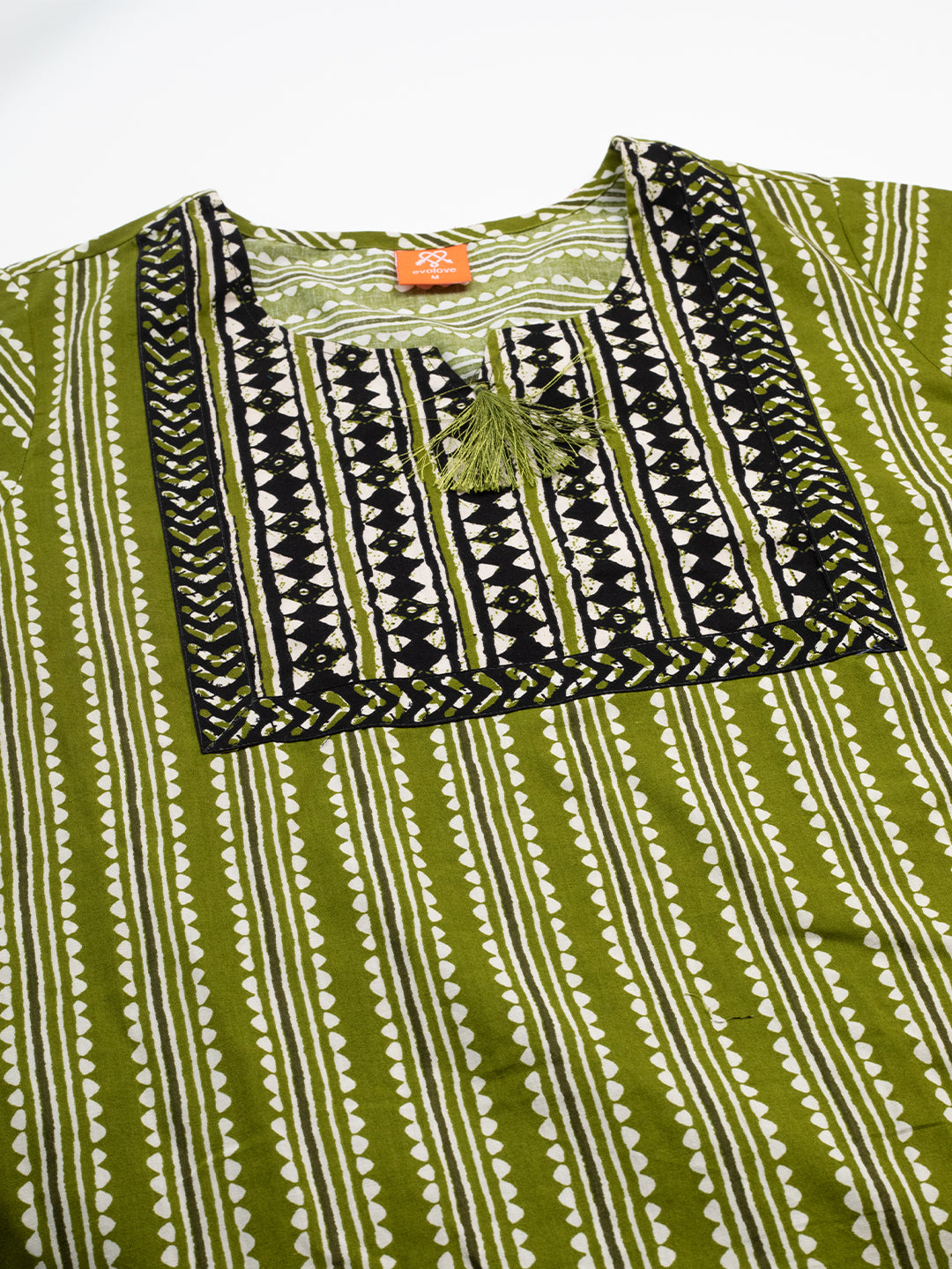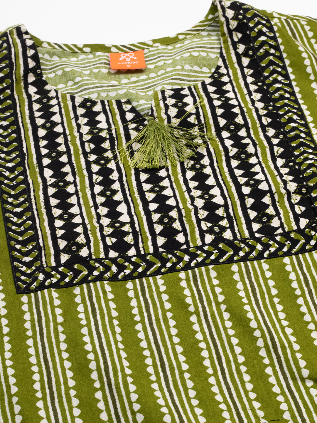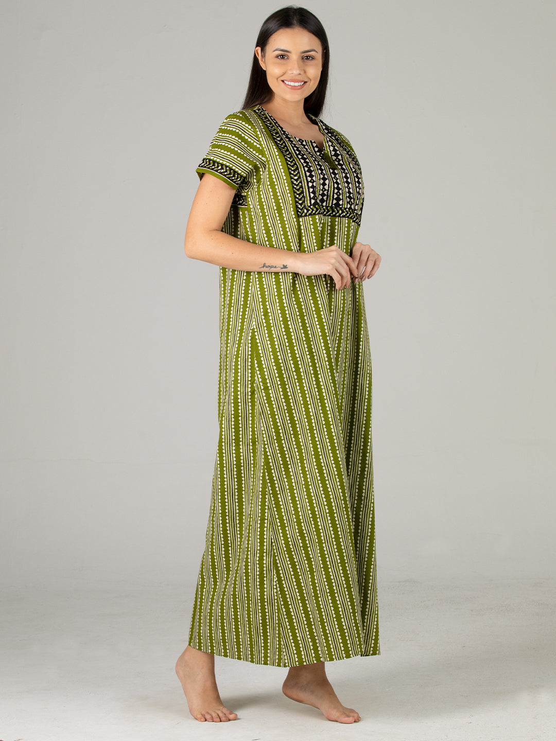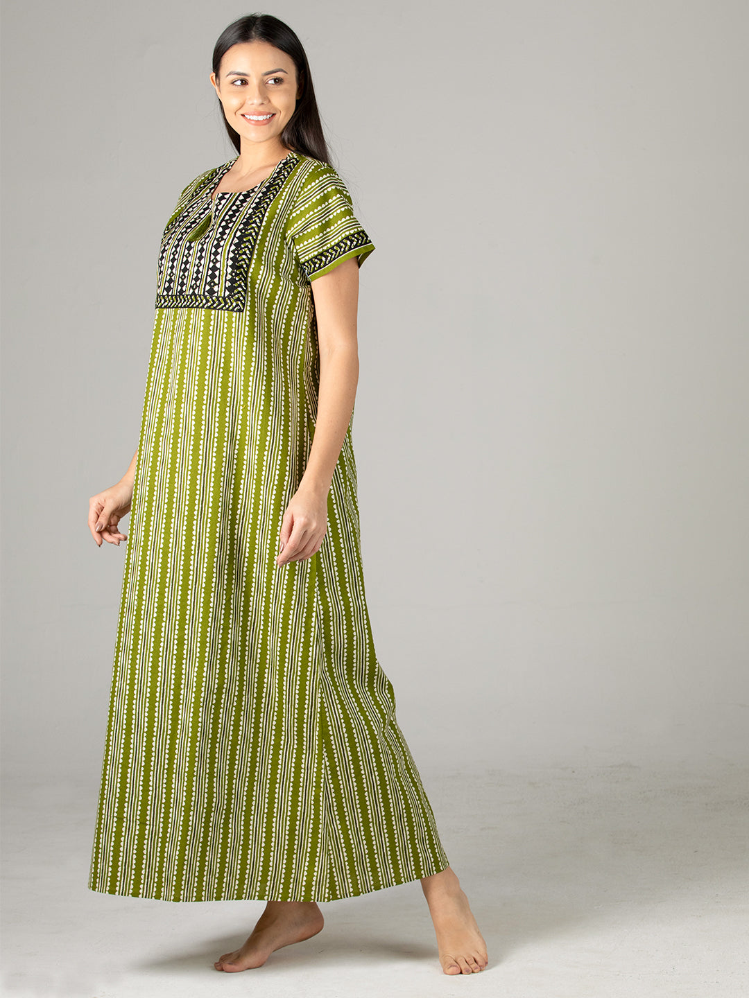 - Design & Style : The Pull On Closure Maxi or Nighty has Side Pocket to keep your Phone or Other Goodies Safe; Olive Green in Colour & Strips Printed Stylish Design work done.