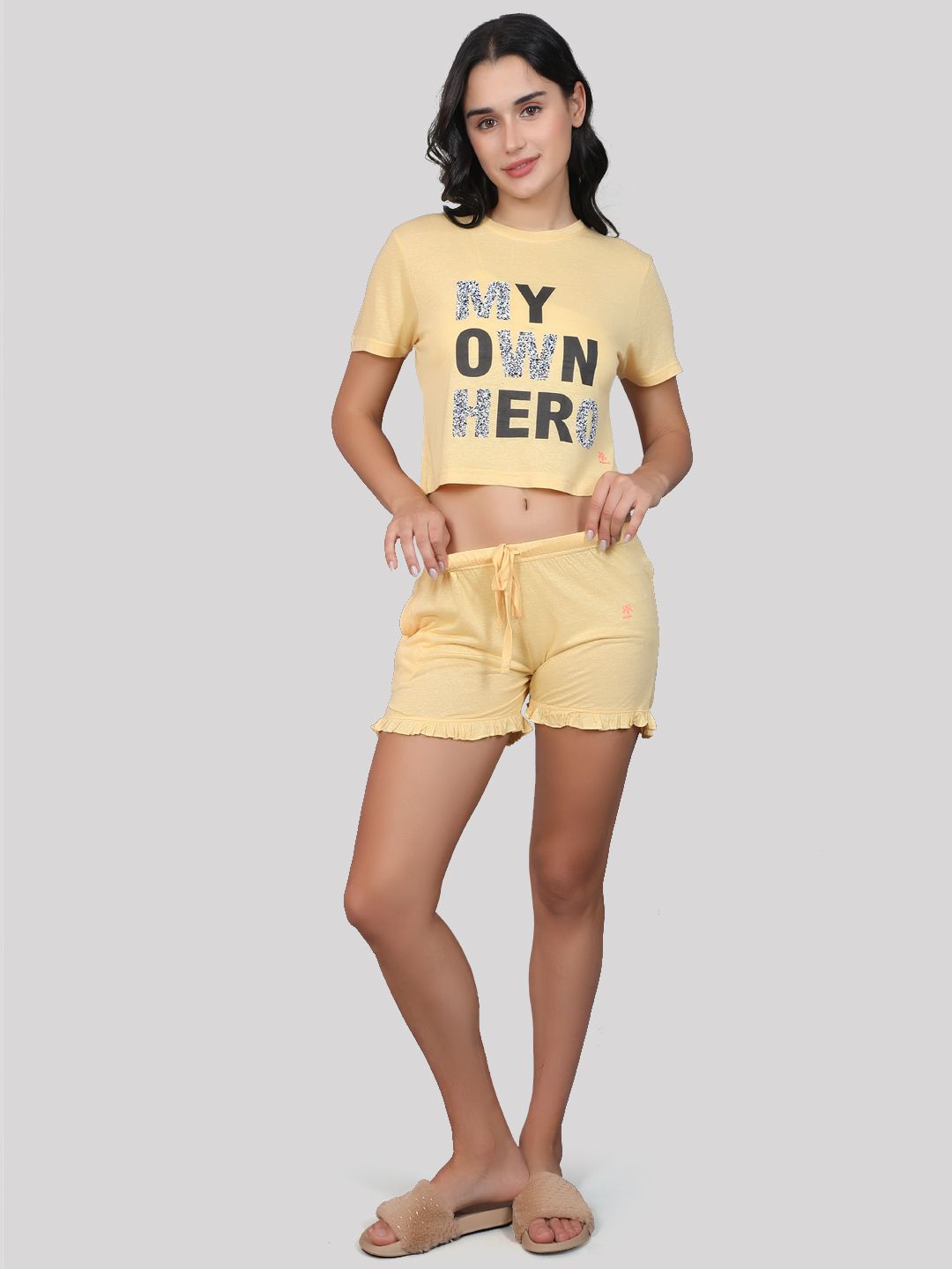 Evolove Women's 100% Cotton Shorts Set | Round Neck Half Sleeves Tshirt Shorts with Pockets Super Soft Comfortable (Yellow)