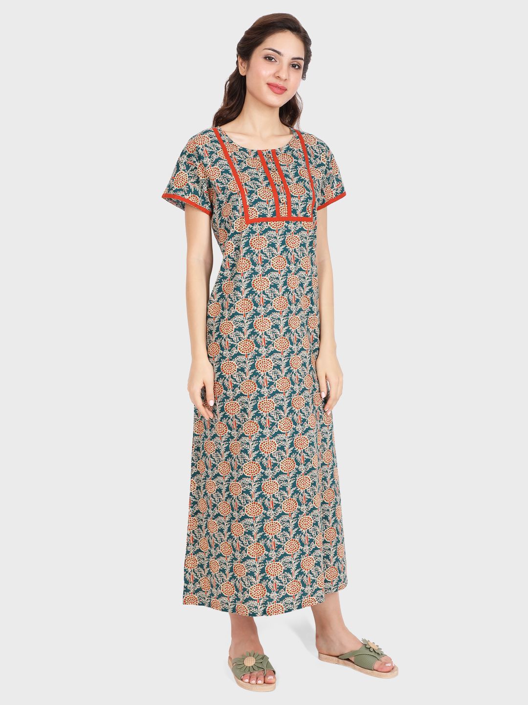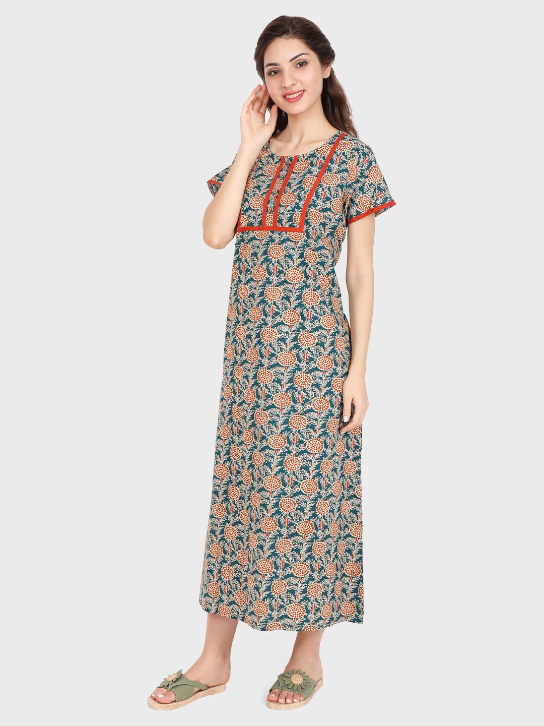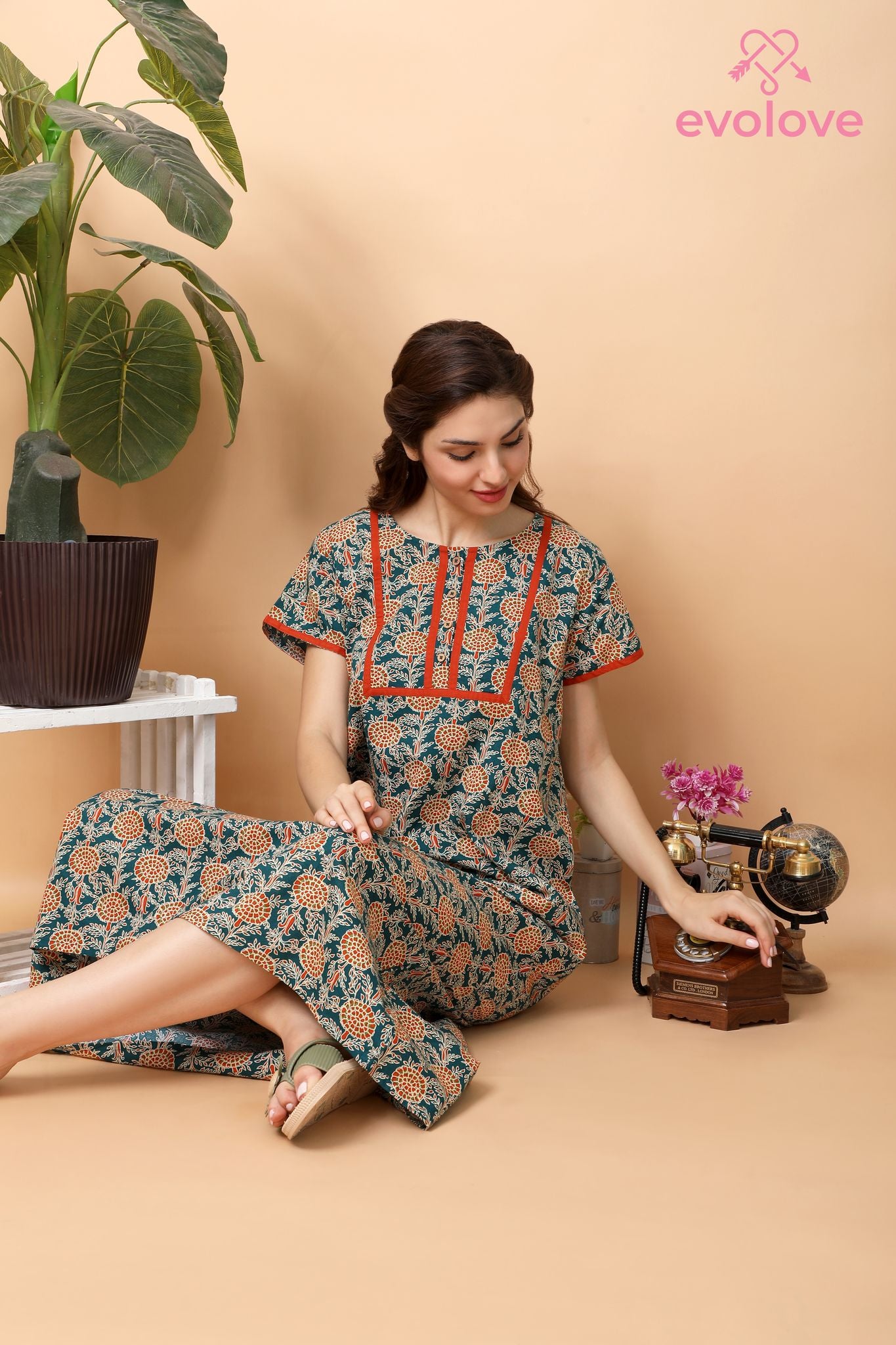 Evolove Women's Cotton Printed Maxi Nighty Sleepwear Super Comfortable & Soft Cotton (Bottle Green)