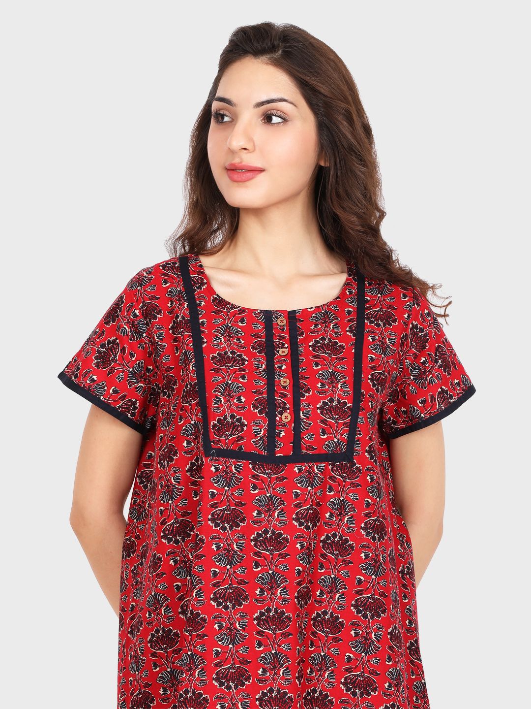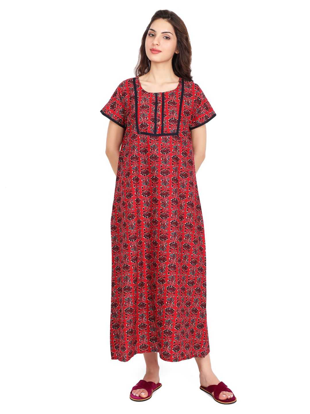 Evolove Women's Cotton Printed Maxi Nighty Sleepwear Super Comfortable & Soft Cotton (Maroon)