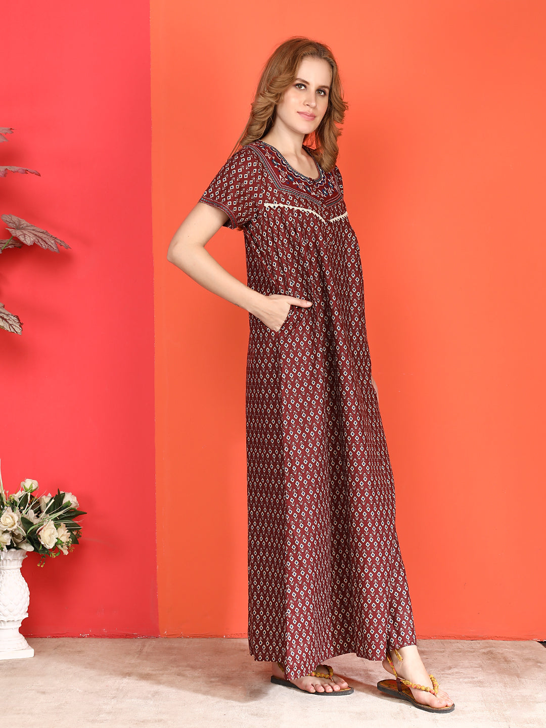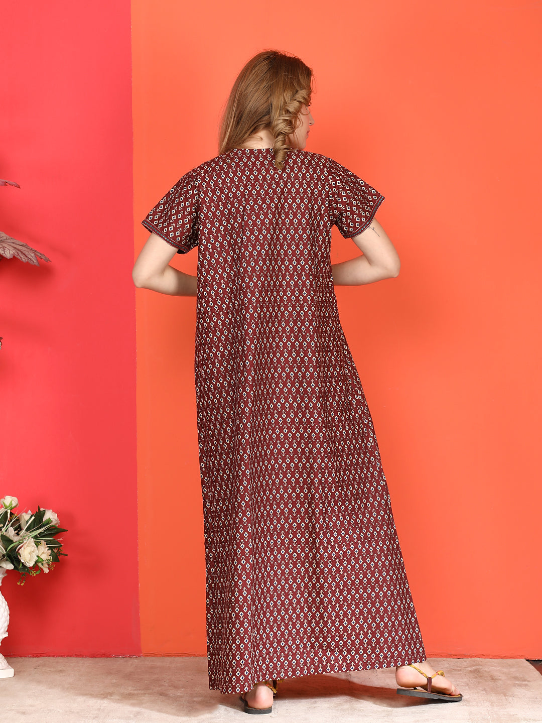 🌸 Evolove Cotton Nighty Maxi for Women Printed Short Sleeves | Full-Length | Side Pocket