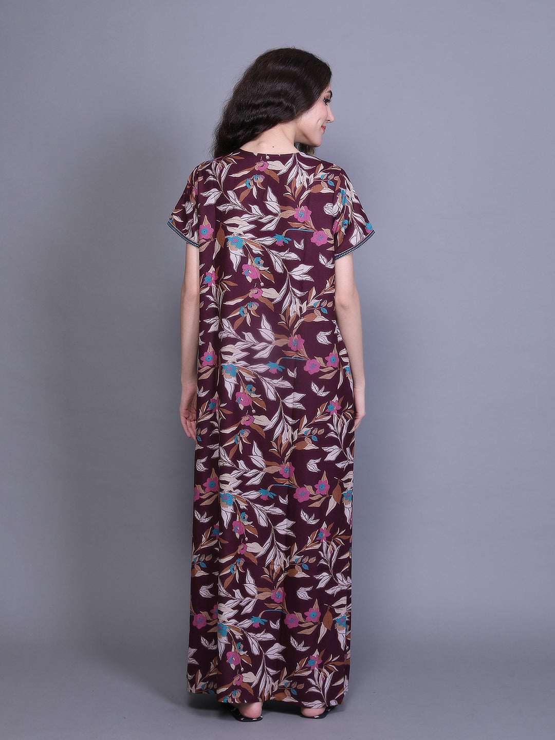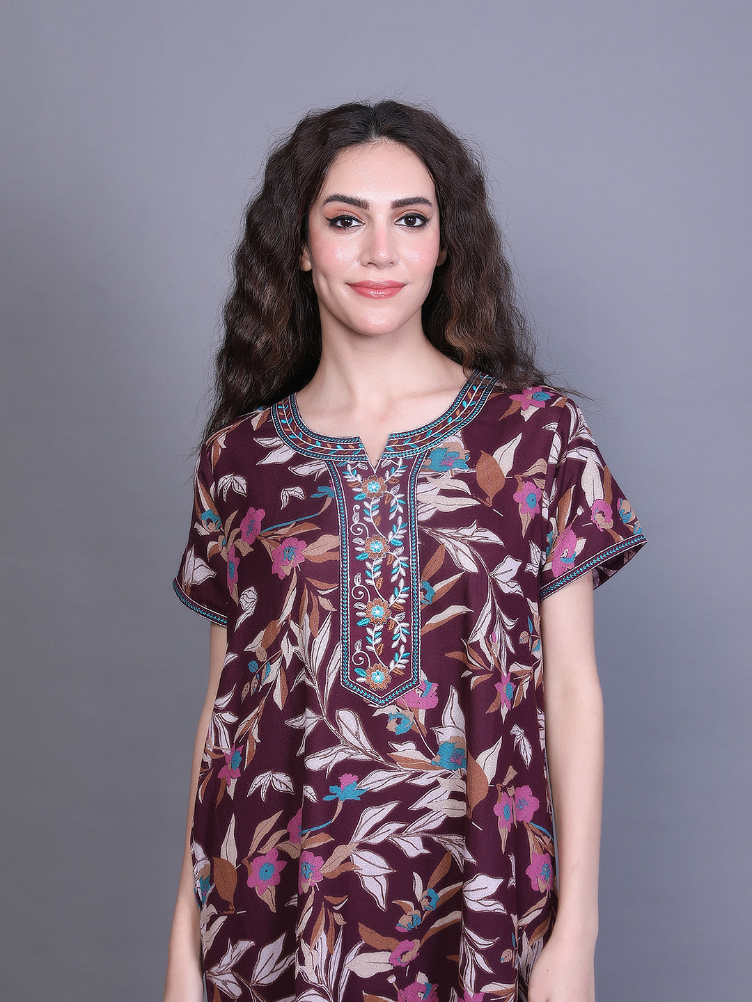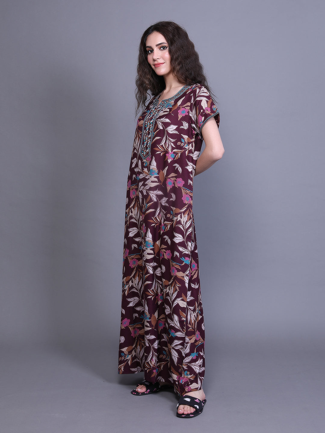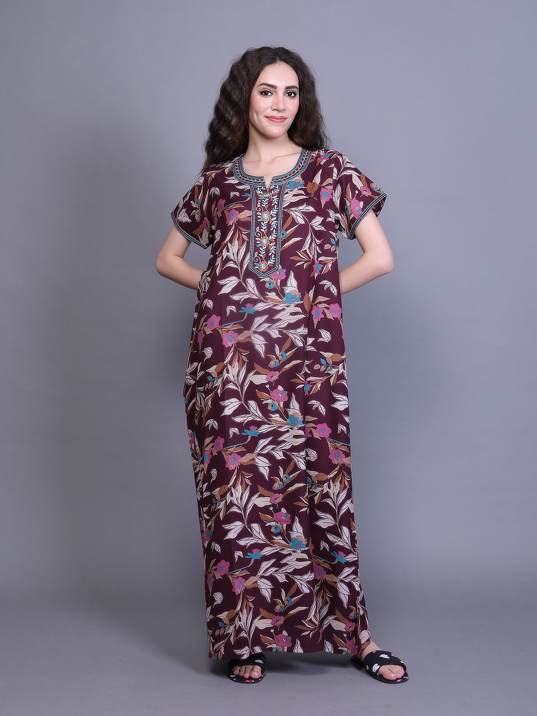 Alpine Fabric Nighty Maxi for Women with Side Pocket and Neckline Embroidery | Printed Short Sleeves Full Length