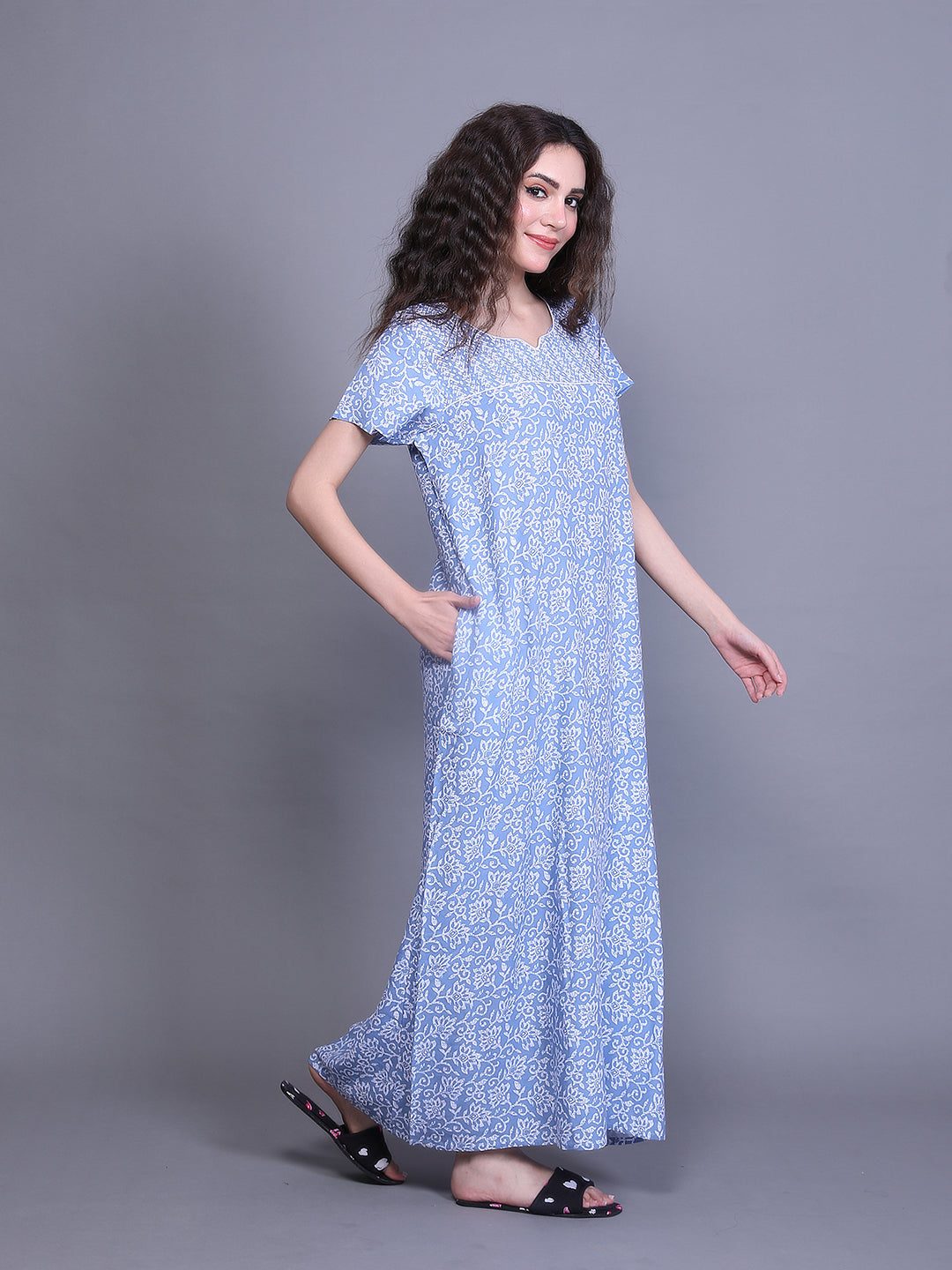 Cotton Nighty Maxi for Women with Side Pocket | Printed Short Sleeves Full Length