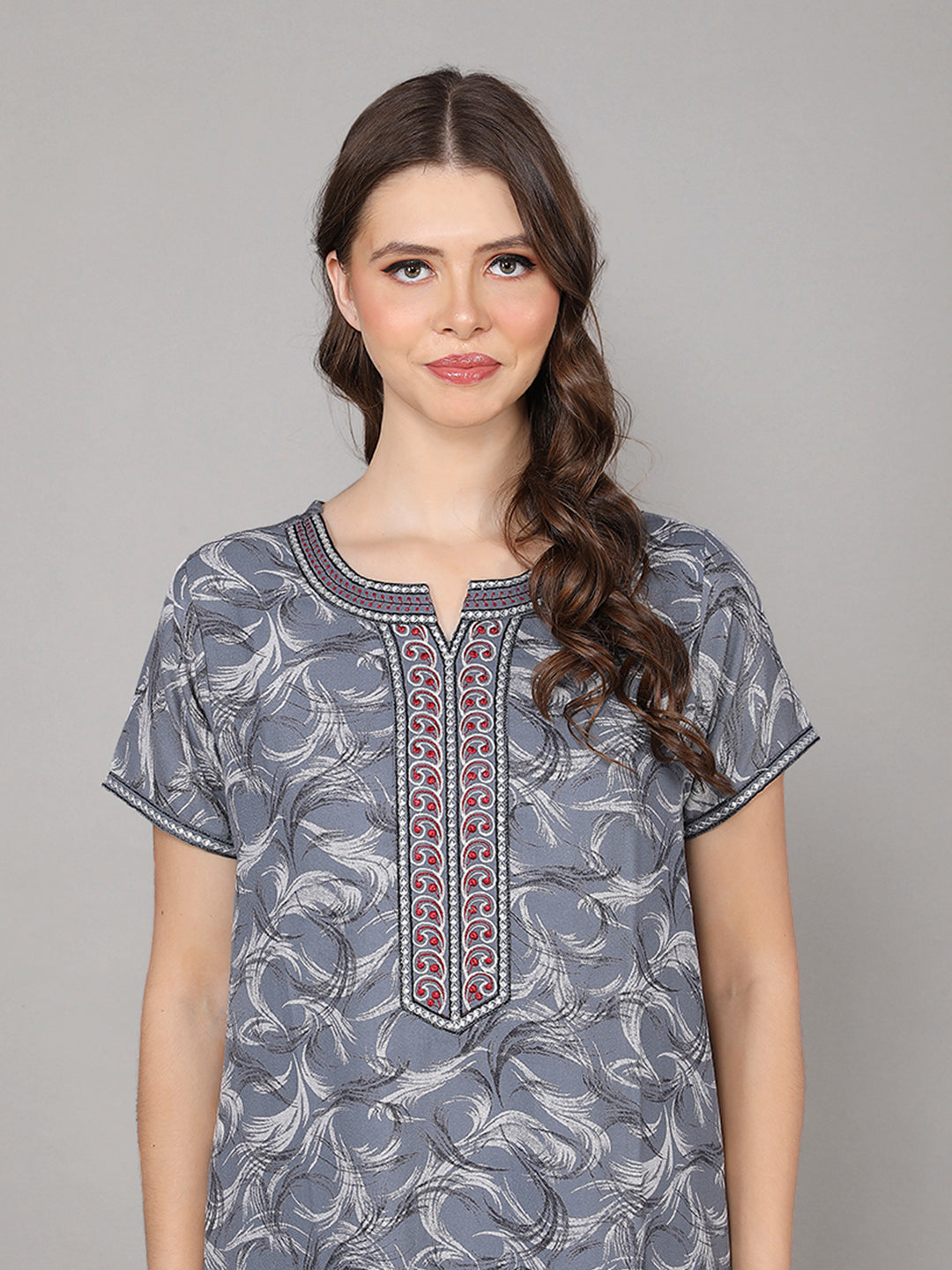 Alpine Nighty with Side Pocket & Neckline Embroidery | Printed