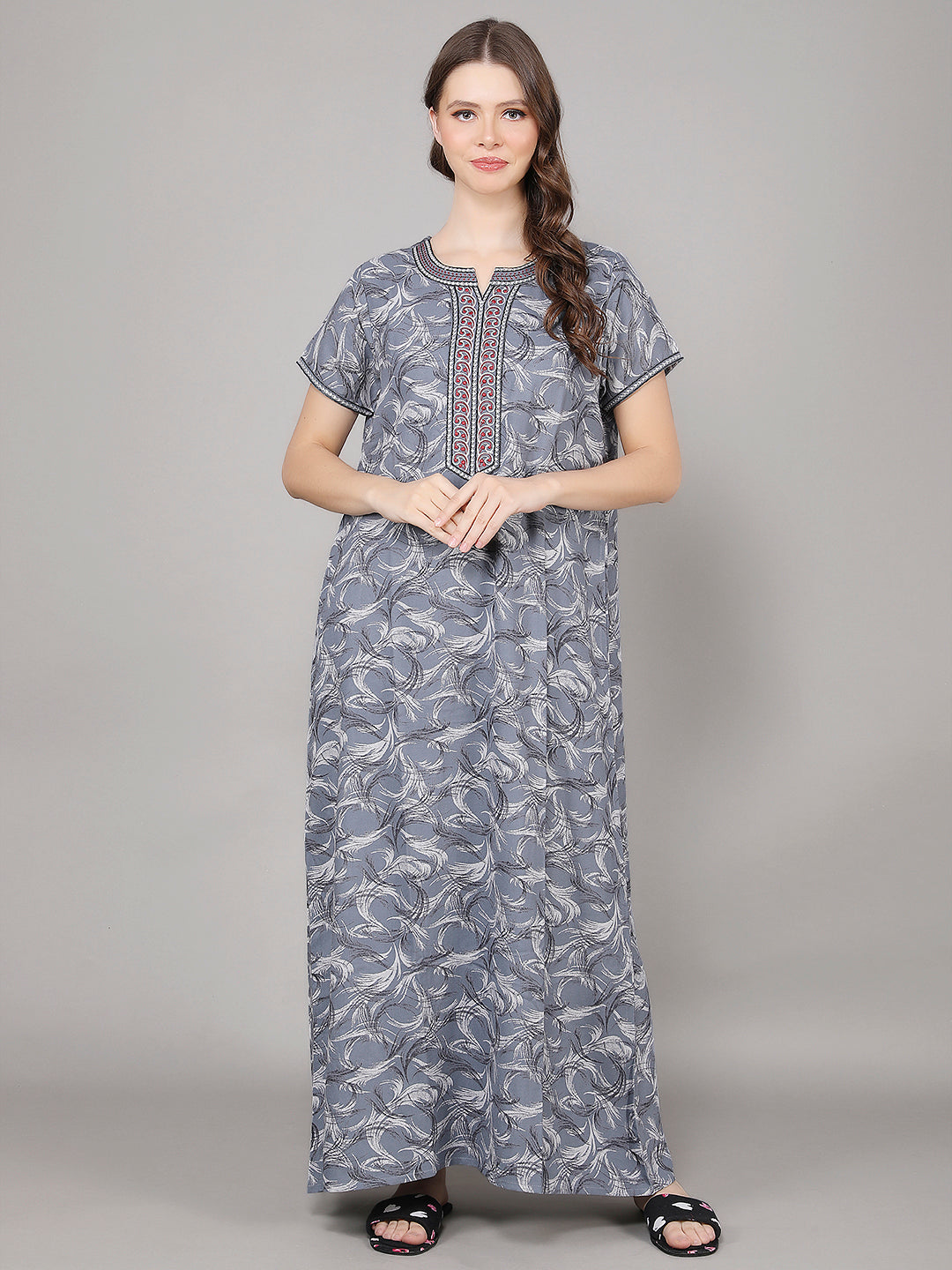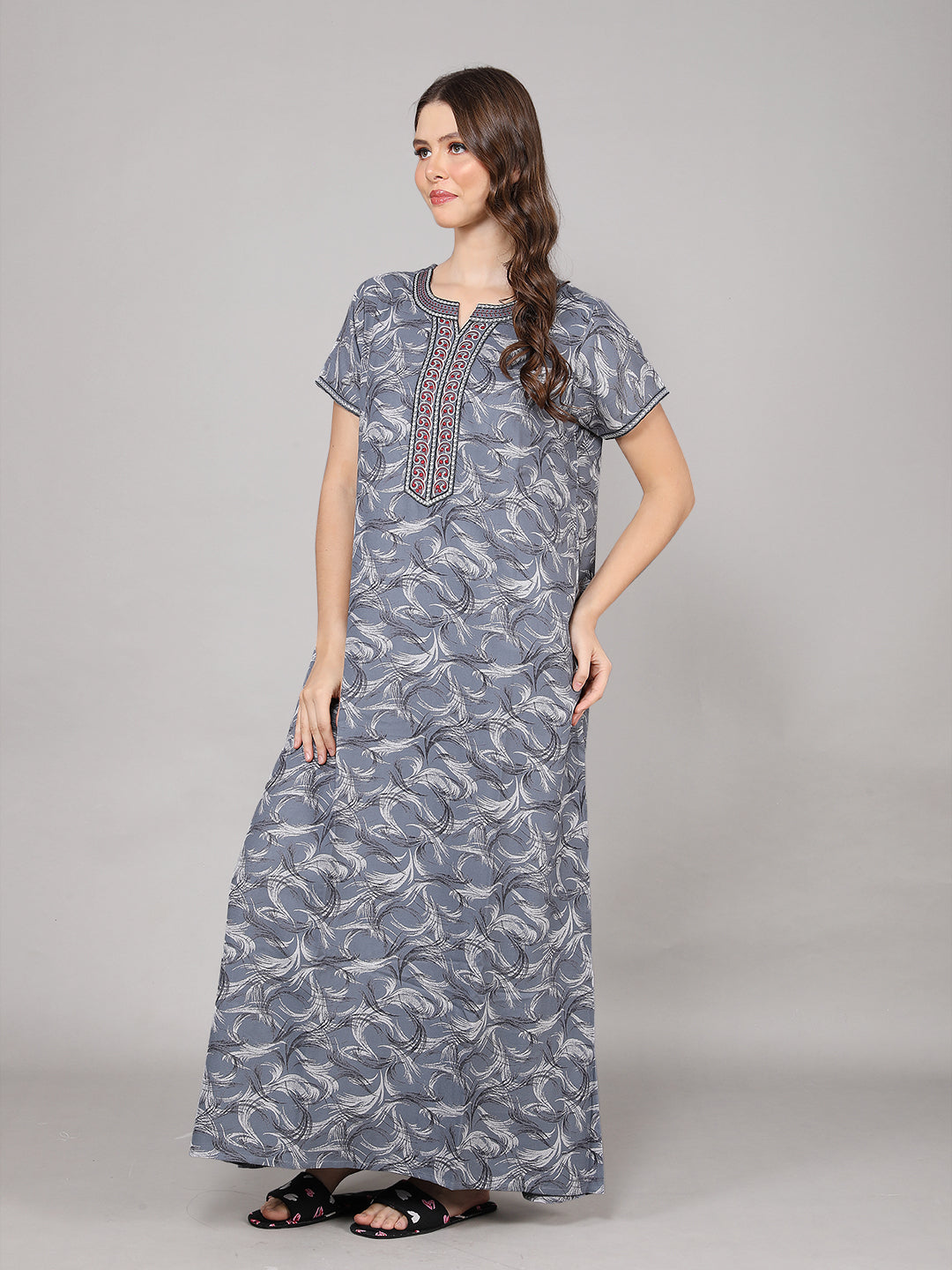 Alpine Fabric Nighty Maxi for Women with Side Pocket and Neckline Embroidery | Printed Short Sleeves Full Length