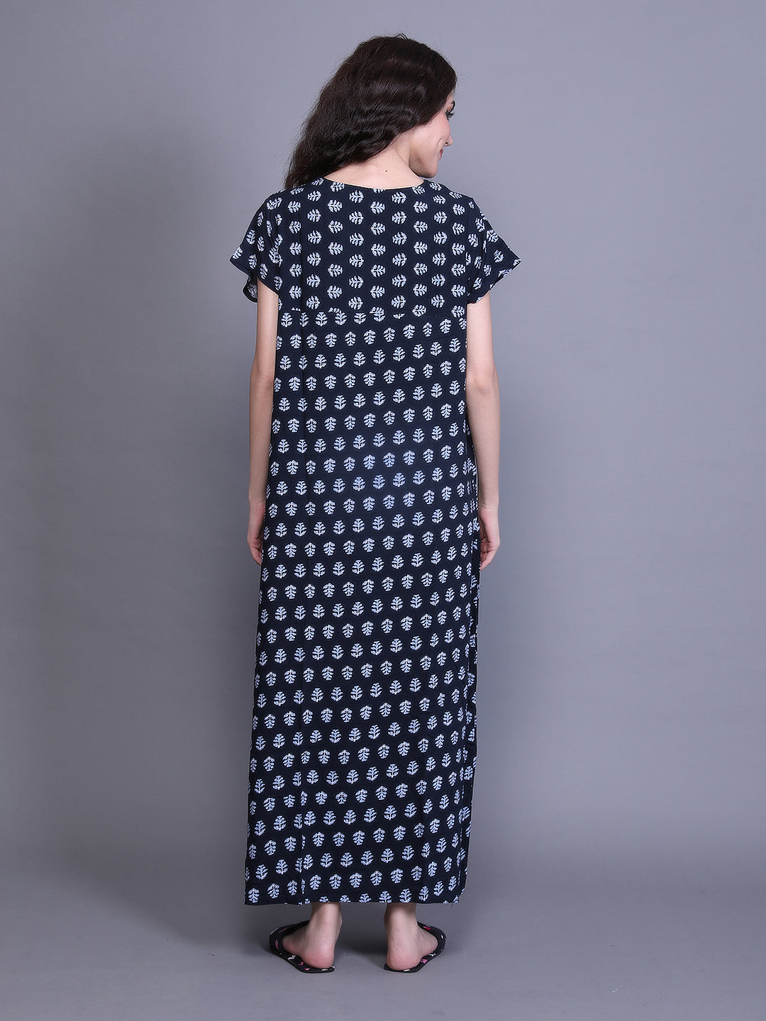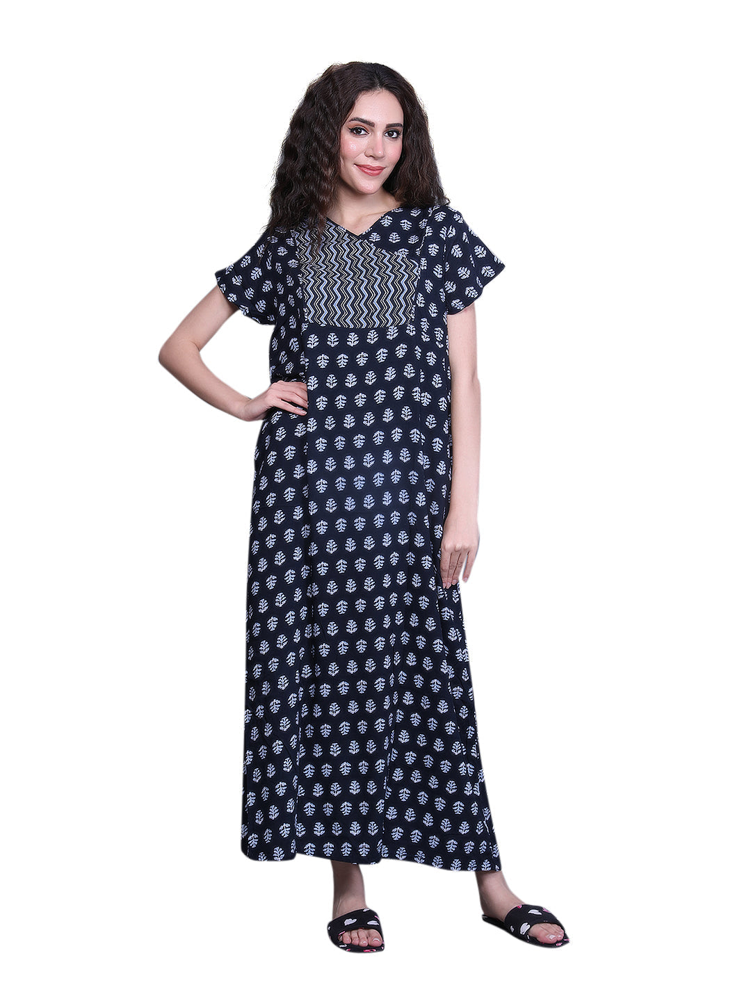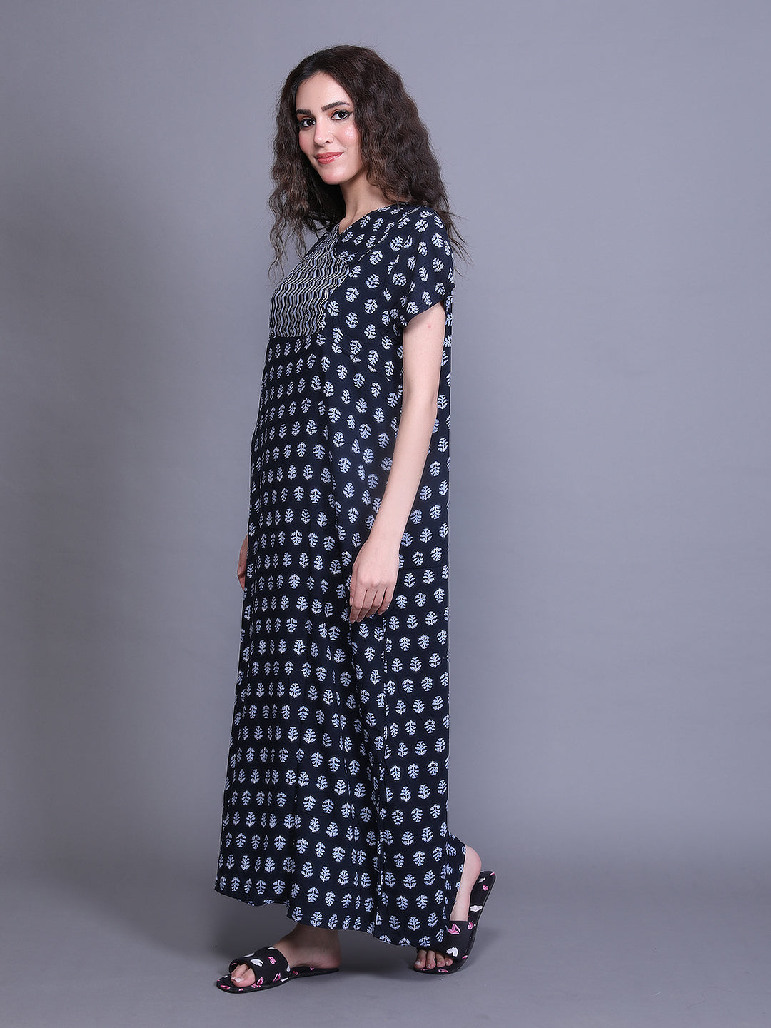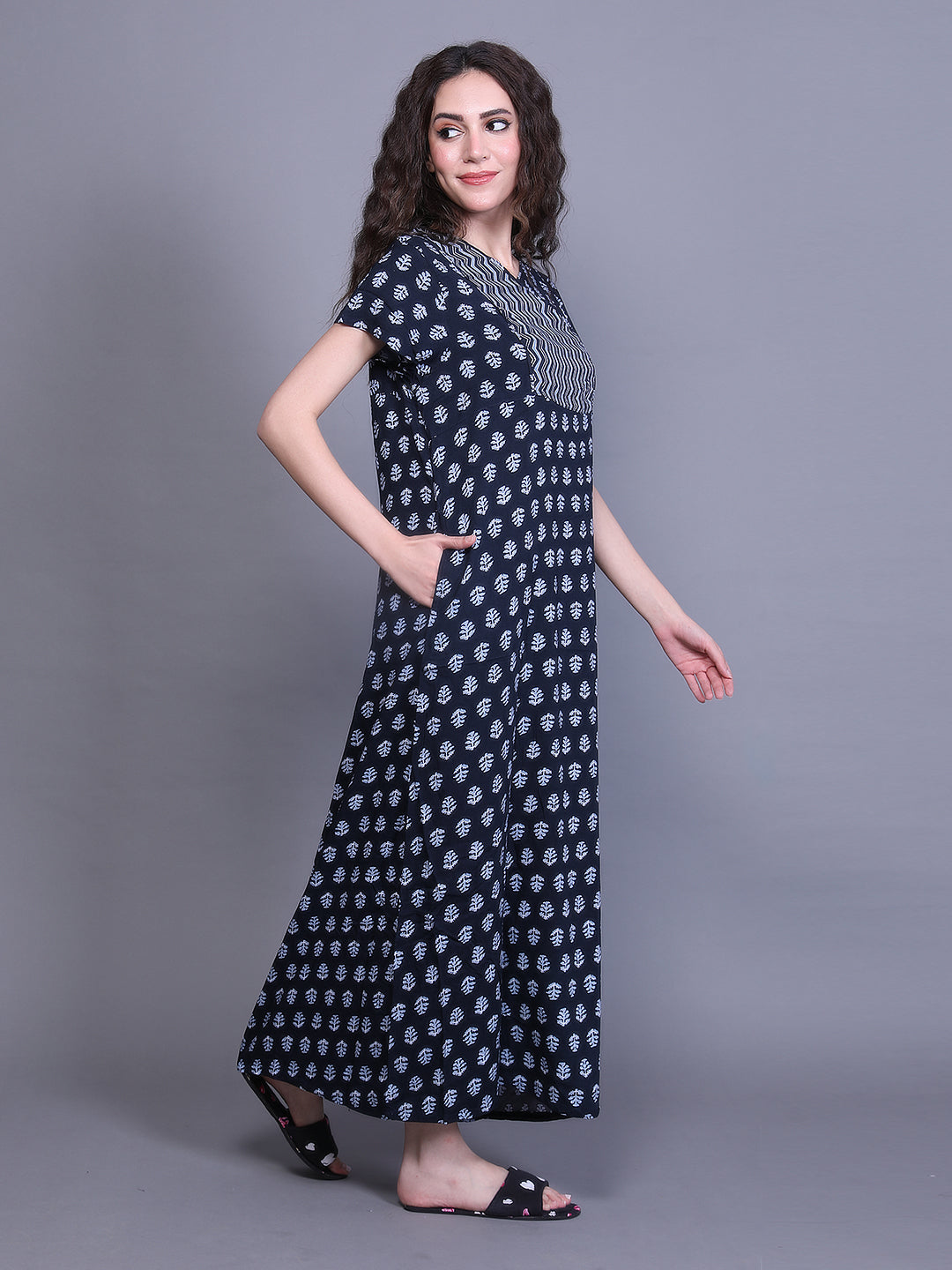 Cotton Nighty Maxi for Women with Side Pocket | Printed Short Sleeves Full Length