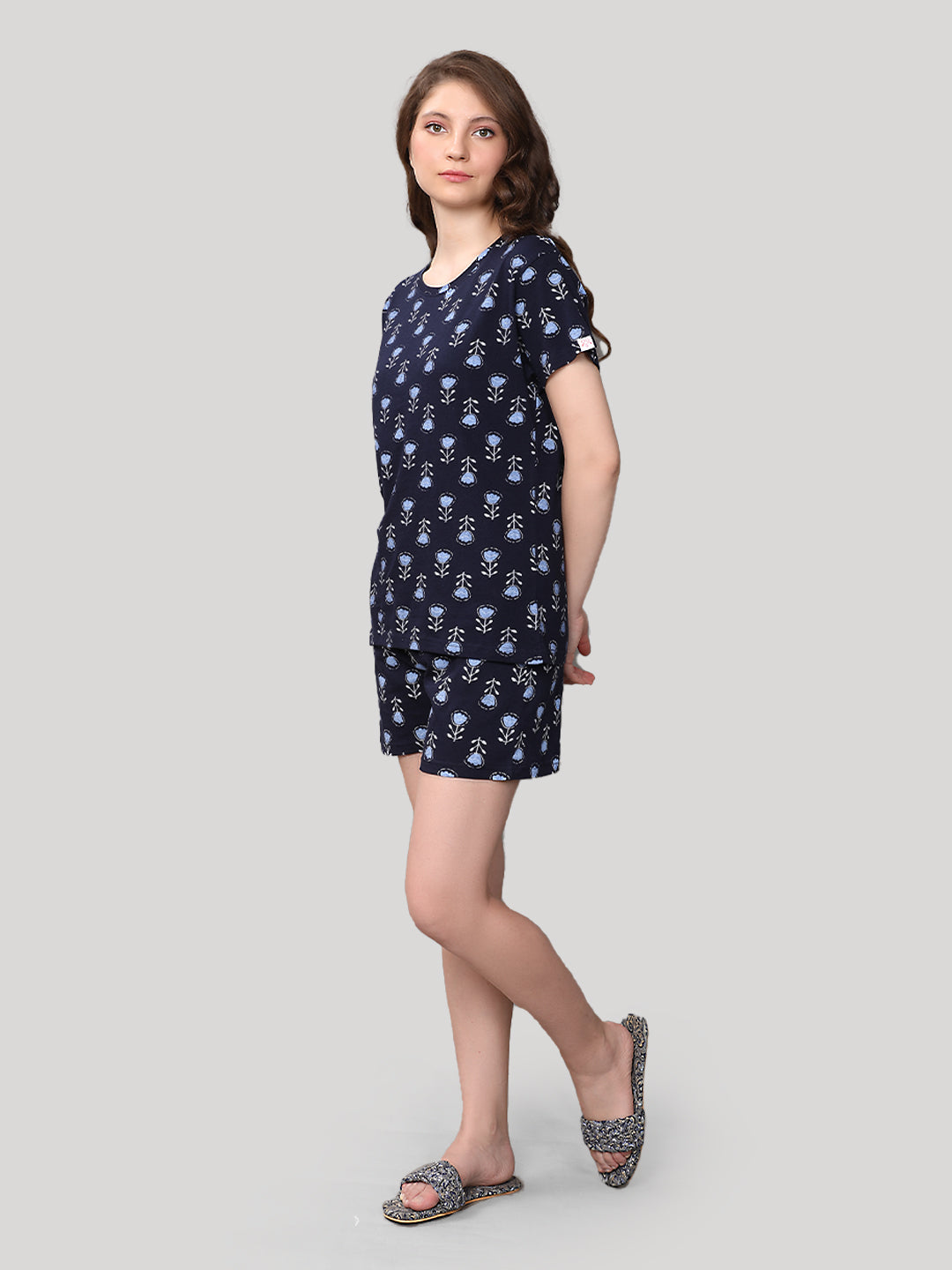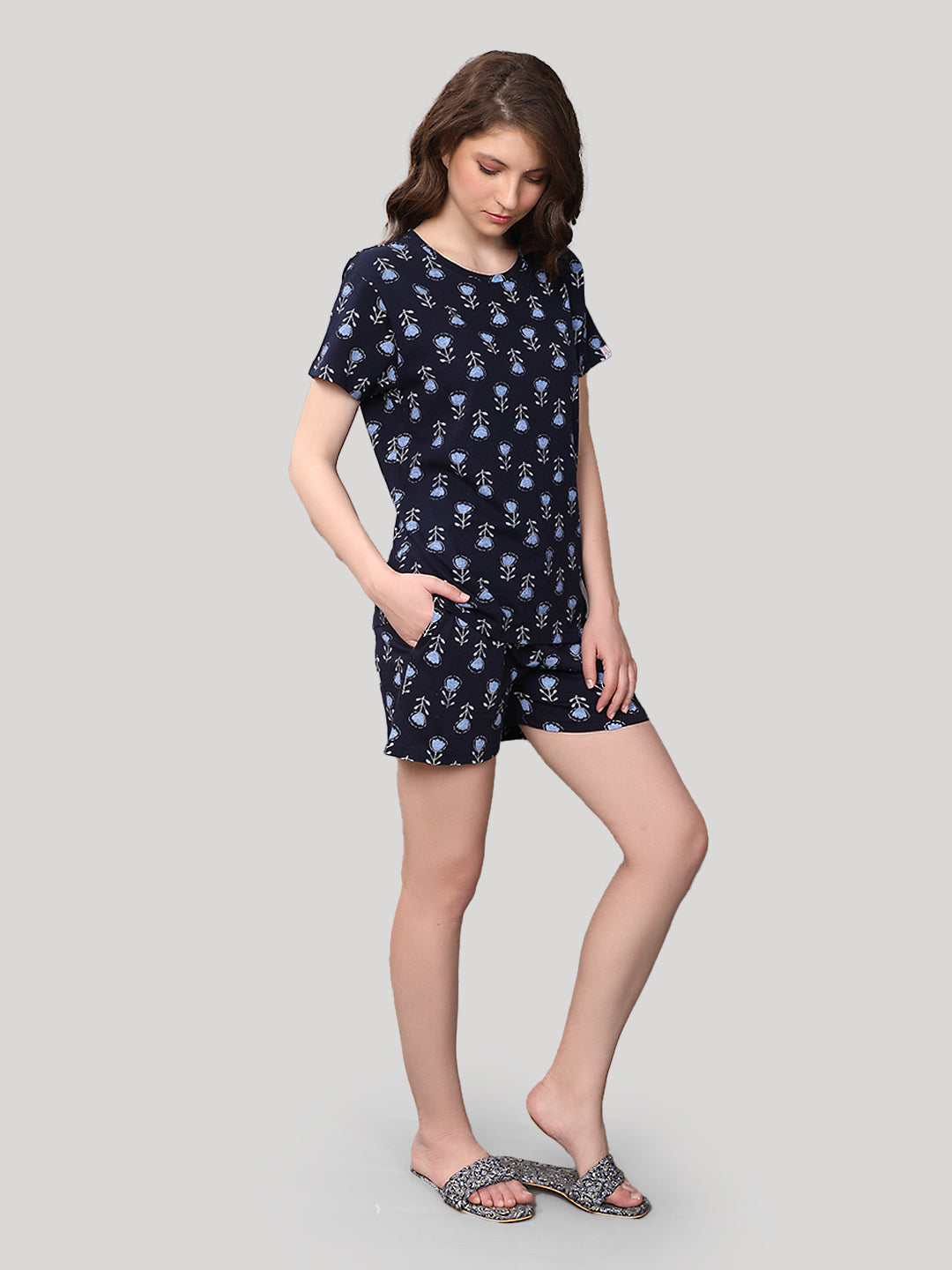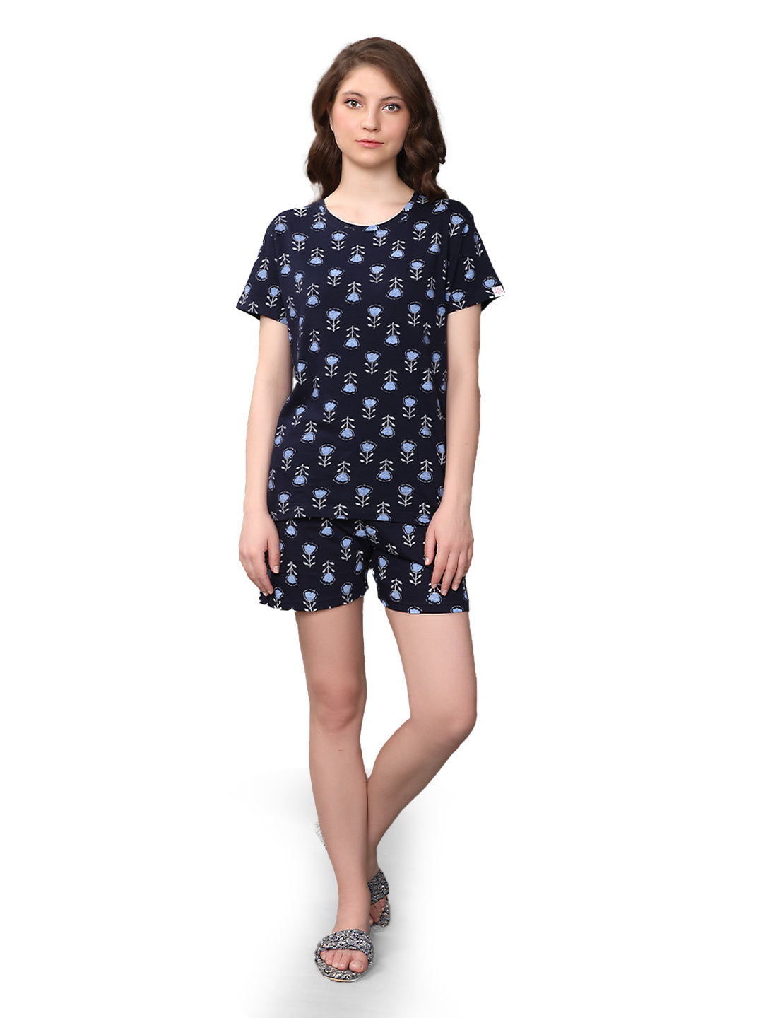 .Colour: Navy. .Fabric: Cotton Hosiery || Soft Waist Elastic with stylish drawstring and convenient side pocket for that classic finishing to your lounge wear.. .Package Content: 1 set of Printed T-shirt & All-over-print Shorts Set. .Soft & comfortable. Perfect gift for your loved ones, can be worn for casual walk, evenings, as nightwear, sleepwear, night dress and all-daywear.鑱. .For more collections in Pyjama, Nightsuit, Capris, Palazzo, Culottes, Track Pants, Bra & Panties, visit our Amazon Store by clicking on our Brand Name ..
